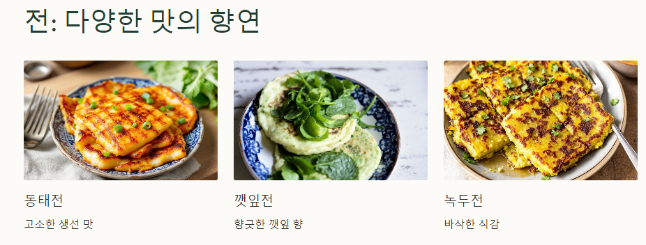 전은 종류가 다양해 각자의 취향에 맞게 선택할 수 있는 음식입니다. 가족들과 함께 전을 부쳐 먹으며 즐거운 시간을 보내세요.
