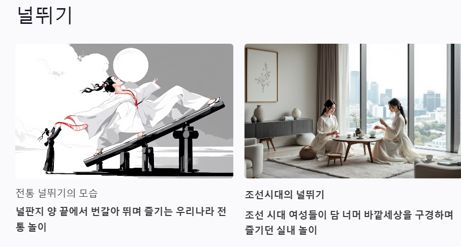 널뛰기는 조선 시대부터 전해져 내려온 놀이로, 주로 여자들이 집 안에서 할 수 있는 놀이로 시작되었습니다. 널뛰기는 특히 명절이나 축제 때 많이 행해졌습니다.