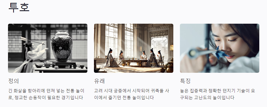 투호는 고려 시대부터 전해 내려온 전통 놀이로, 과거에는 궁중에서 신하들이 즐기던 놀이였습니다. 투호는 집중력과 정확성을 요구하는 놀이입니다.