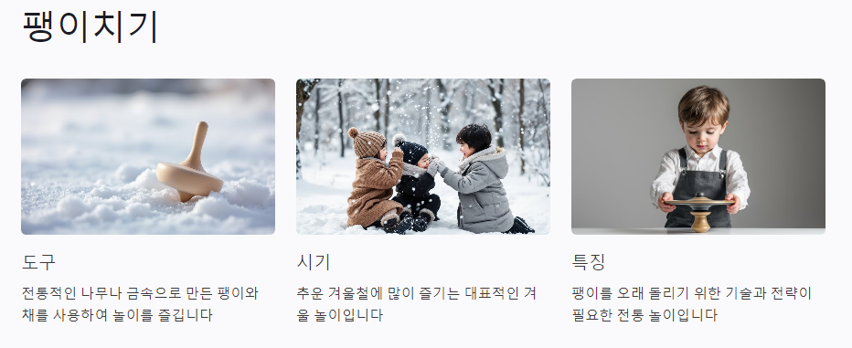 팽이치기는 오래된 전통 놀이로, 과거에는 남자아이들이 주로 즐겼습니다. 팽이를 잘 돌리는 것이 기술과 힘을 나타내는 것으로 여겨졌습니다.