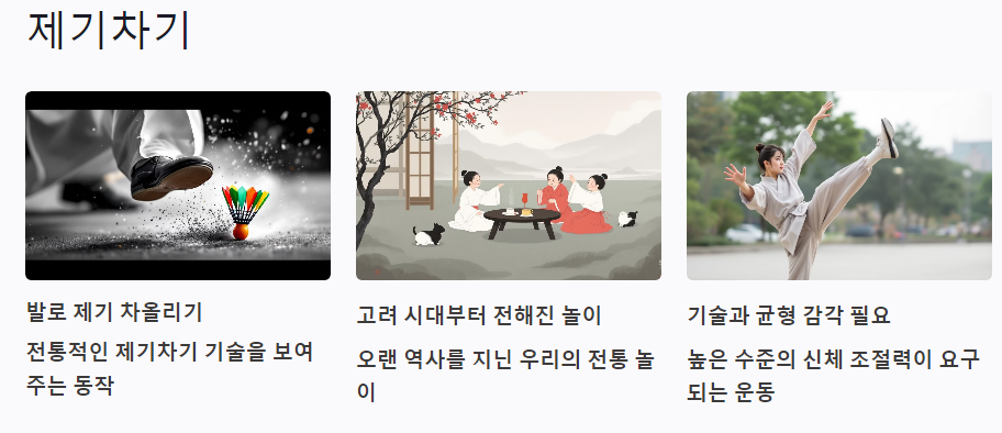 제기차기는 고려 시대부터 전해 내려온 전통 놀이로, 주로 남자아이들이 즐겼습니다. 옛날에는 제기를 잘 차는 것이 남자의 능력을 나타내는 것으로 여겨졌습니다.