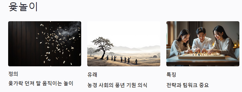 윷놀이는 한국의 대표적인 전통 놀이로, 주로 설날과 같은 명절에 가족과 친구들이 모여 즐깁니다. 윷가락을 던져 나온 결과에 따라 말을 움직이며 승부를 겨루는 놀이입니다.
