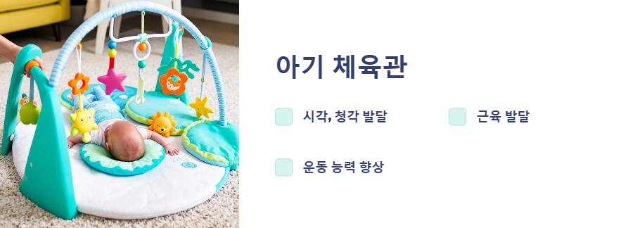 아기 체육관은 아기가 누워서 손과 발을 사용하며 놀 수 있는 공간을 제공합니다. 다양한 장난감과 소리가 나는 요소들이 포함되어 있어 아기의 시각과 청각 발달에 도움을 줍니다. 이 제품은 아기가 근육을 발달시키고, 운동 능력을 향상시키는 데 효과적입니다.
