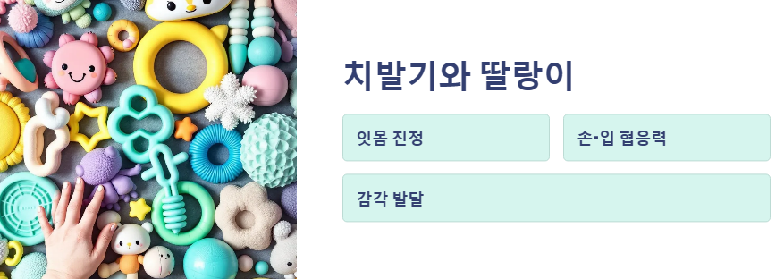 치발기와 딸랑이는 아기가 이가 나기 시작할 때 유용합니다. 이 제품들은 아기의 잇몸을 진정시키고, 손과 입의 협응 능력을 발달시키는 데 도움을 줍니다. 다양한 질감과 소리를 가진 제품들이 많아 아기의 감각 발달에도 기여합니다.