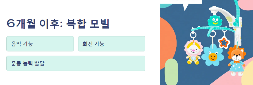이처럼 아기 모빌은 아기의 성장 단계에 맞춰 적절히 선택하고 사용해야 하며, 각 시기에 맞는 모빌을 통해 아기의 감각 발달을 도울 수 있습니다.