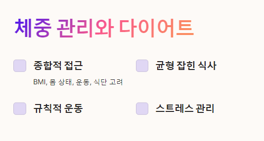 체중 관리를 위해서는 단순히 BMI 수치만 보는 것이 아니라, 자신의 몸 상태와 운동 습관, 식단 등을 종합적으로 고려해야 합니다. 건강한 다이어트를 위해서는 균형 잡힌 식사를 하고, 규칙적인 운동을 하며, 스트레스를 관리하는 것이 중요합니다.