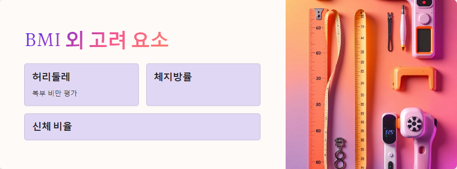 BMI 외에도 여러 지표를 통해 자신의 건강 상태를 체크하는 것이 좋습니다. 예를 들어, 허리둘레, 체지방률, 신체 비율 등을 함께 고려하면 보다 정확한 건강 상태 평가가 가능합니다. 특히, 허리둘레는 복부 비만을 평가하는 데 중요한 지표로 작용합니다. 이와 같은 다양한 지표를 활용하여 체중 관리에 접근해야 합니다.