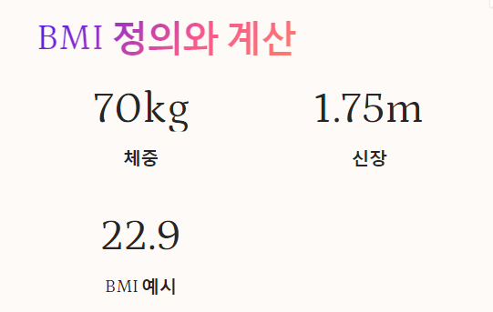 체질량지수(BMI)는 개인의 체중과 신장을 바탕으로 비만도를 간단하게 평가할 수 있는 지표입니다. 이 지수는 체중(kg)을 신장(m)의 제곱으로 나누어 계산합니다. 예를 들어, 70kg의 몸무게를 가진 사람이 1.75m의 신장을 가질 경우, BMI는 22.9로 계산됩니다. 이 수치는 일반적으로 '정상 체중' 범위에 해당합니다.