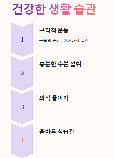 건강한 생활 습관은 체중 관리에 매우 중요한 요소입니다. 규칙적인 운동을 통해 근육량을 늘리고, 신진대사를 촉진시켜야 합니다. 그리고, 매일 충분한 수분을 섭취하고, 외식이나 패스트푸드 소비를 줄이는 것도 체중 관리를 위해 효과적입니다. 올바른 식습관을 유지하는 것은 비만 예방과 건강한 체중 유지에 필수적입니다.