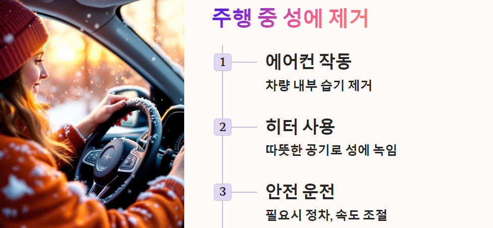 주행 중에도 성에를 제거하는 방법이 있습니다. 차량의 에어컨을 작동시키고, 히터를 통해 따뜻한 공기를 유리창 방향으로 보내면 성에가 서서히 녹아내립니다. 이때 운전자가 시야를 확보하기 위해 잠시 정차하거나, 혹은 도로 상황을 고려하여 운전 속도를 조절하는 것이 필요합니다.