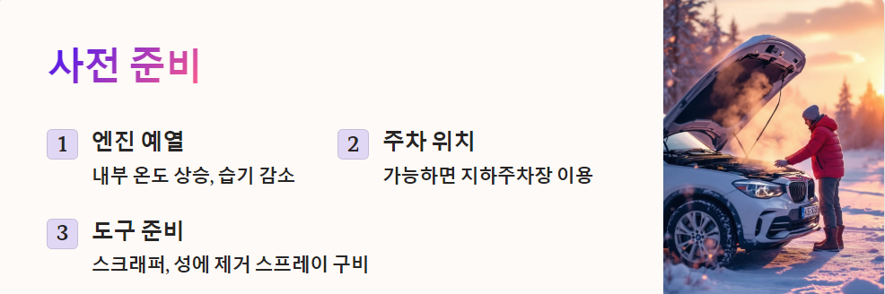 성에를 제거하기 전, 몇 가지 준비를 해두면 좋습니다. 먼저, 차량의 엔진을 미리 예열해 주는 것이 좋습니다. 엔진이 예열되면 차량 내부의 온도가 상승하고, 이는 에어컨 작동 시 공기 중의 습기를 줄여 성에가 쉽게 제거됩니다. 주차를 할 때는 가능한 한 지하주차장을 이용하는 것도 성에를 예방하는 데 도움이 됩니다.