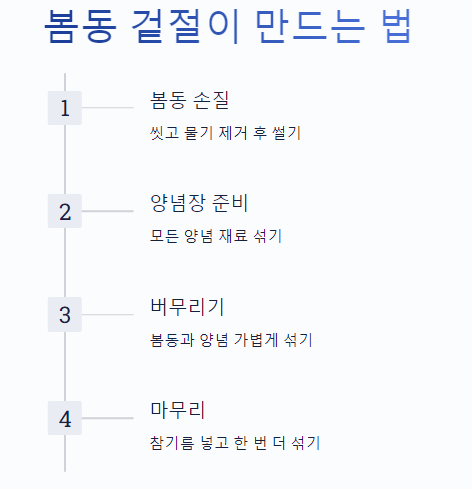 3. 봄동 버무리기 : 손질한 봄동을 양념장에 넣고 가볍게 버무려줍니다. 이때, 너무 세게 버무리면 봄동이 물러지니 주의해야 합니다.