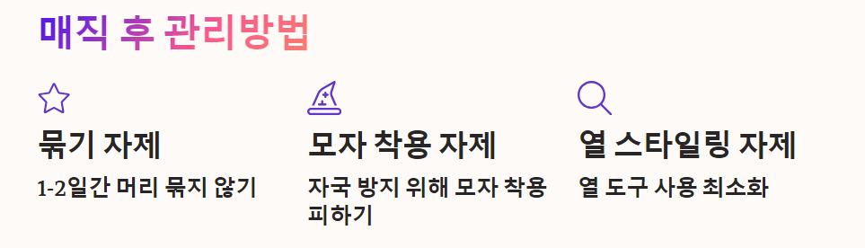 매직 후에는 열 스타일링 도구를 사용하지 않는 것이 좋습니다. 열로 인한 손상이 머리카락의 펴짐 효과를 감소시킬 수 있기 때문입니다. 자연건조를 통해 머리카락을 관리하는 것이 가장 좋습니다.