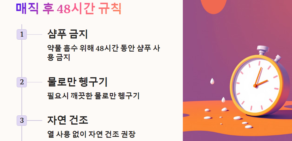매직 후 첫 48시간 동안은 머리를 감지 않는 것이 중요합니다. 이 시간이 지나야 약물이 머리카락에 잘 흡수되어 펴짐 효과가 유지됩니다.