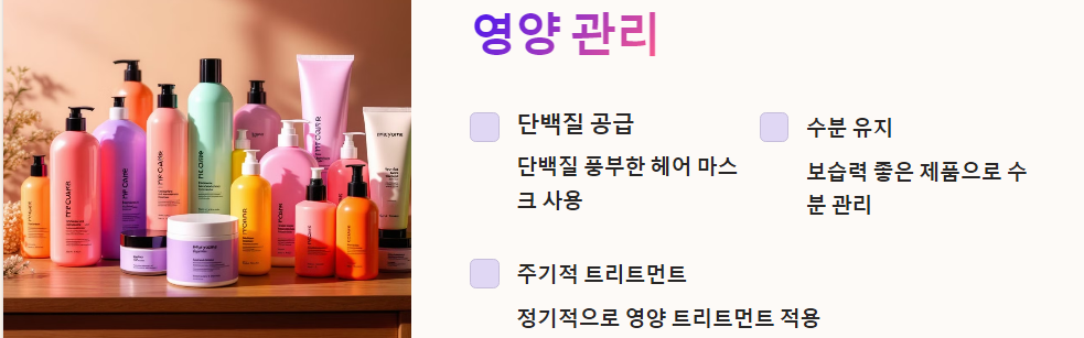 매직 후에는 머리카락에 충분한 영양을 공급해주는 것이 중요합니다. 영양이 풍부한 헤어 마스크나 트리트먼트를 주기적으로 사용하여 머리카락의 건강을 유지합니다. 단백질과 수분 공급이 잘 되는 제품을 선택하는 것이 좋습니다.