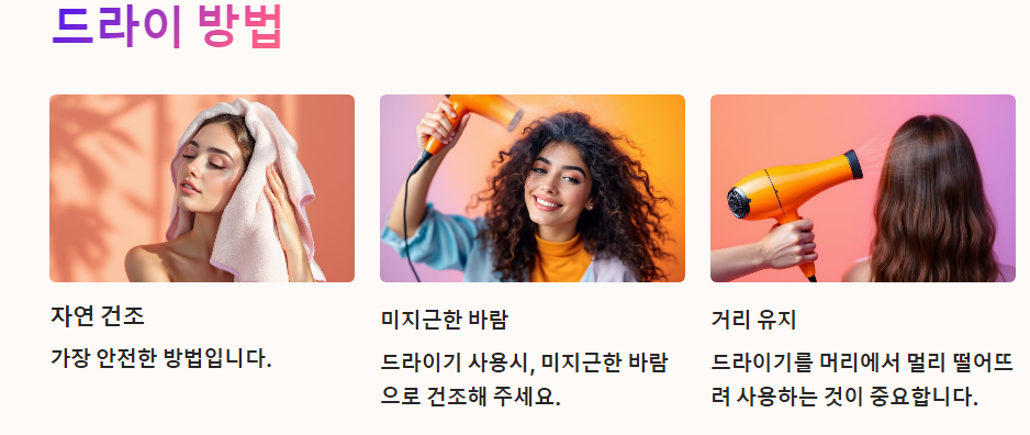 자연건조가 가장 안전한 방법입니다. 드라이기나 열 스타일링 도구를 사용하지 않고 머리를 자연스럽게 말리면 머리카락이 덜 손상됩니다.