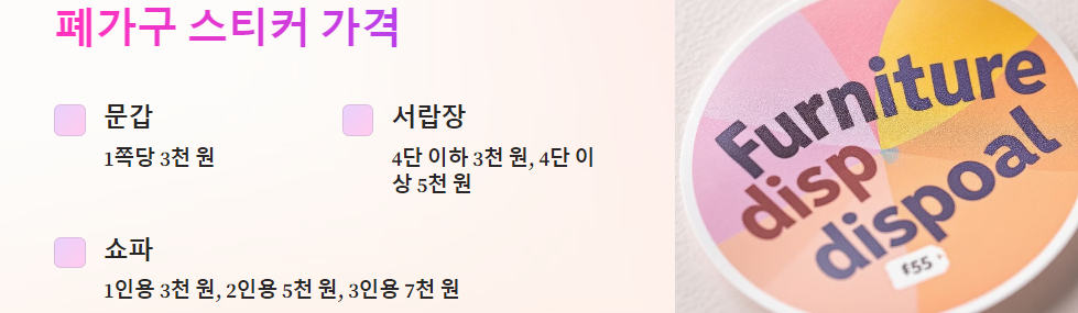 - 폐기물 스티커 구입: 위에서 언급한 장소에서 폐가구 스티커를 구입합니다.