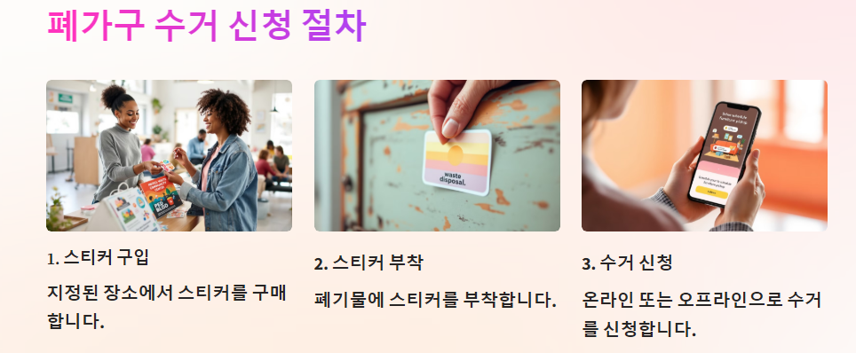 - 수거 신청 방법: 인터넷으로 신청하거나, 주민센터 방문, 스마트폰 앱 사용, 민간 업체 사용 등 여러 방법이 있습니다.