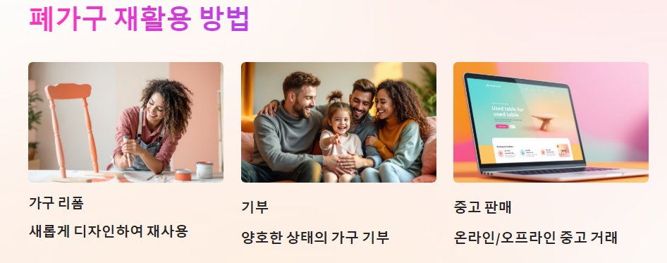 폐가구를 버리기 전에, 재활용할 수 있는 방법을 고려해보세요. 재활용 가능한 가구는 환경 보호에 도움이 됩니다: