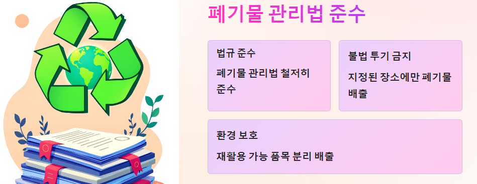 - 불법 투기 금지: 폐기물을 불법으로 투기하지 않도록 주의합니다. 정해진 장소에 배출하여 처리합니다.