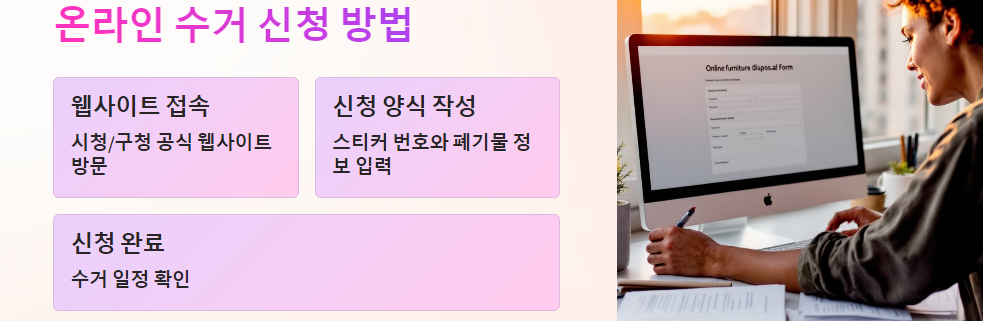 - 시청 또는 구청의 공식 웹사이트에 접속하여 폐기물 수거 신청을 합니다.