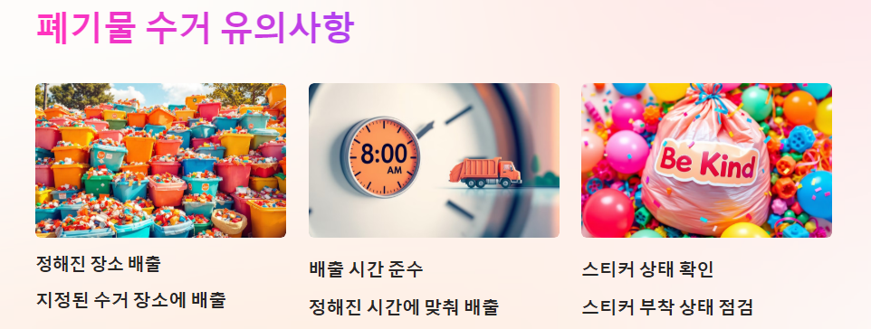 - 배출 시간 준수: 정해진 배출 시간에 맞춰 폐기물을 배출합니다. 일반적으로 이른 아침이나 밤 시간대에 배출할 수 있습니다.