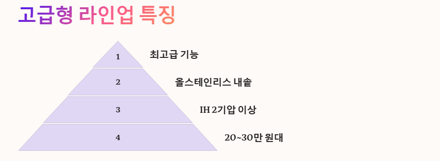 - 중급형 라인은 성능과 가격의 균형이 좋으며, 기준점이 될 수 있다.
