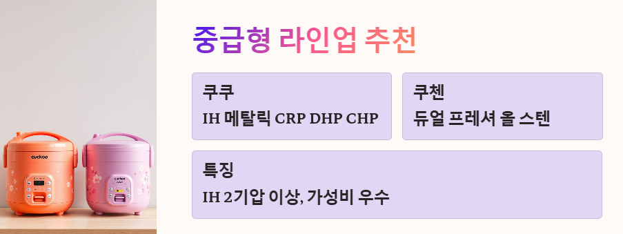 - 중급형 라인은 IH 2기압 이상의 취사 성능을 가지며, 가격 대비 성능의 균형이 좋다. 따라서 성능 좋은 밥솥을 찾는다면 추천할 만하다.