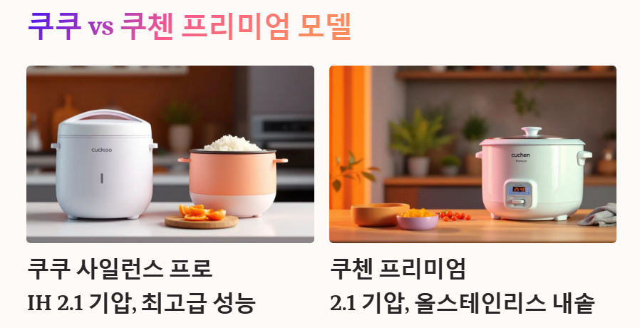 - 쿠쿠의 사일런스 프로와 오브제는 최근 출시된 프리미엄 모델이며, 성능과 기능은 최상급이나 가격이 다소 높다.