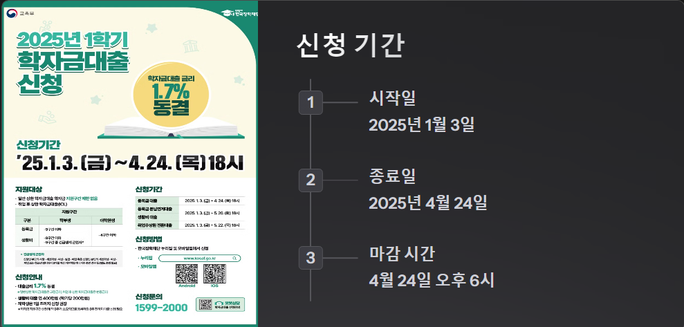 - 등록금 대출 : 신청 기간은 2025년 1월 3일부터 4월 24일까지이며, 대출 실행은 1월 3일부터 가능합니다.