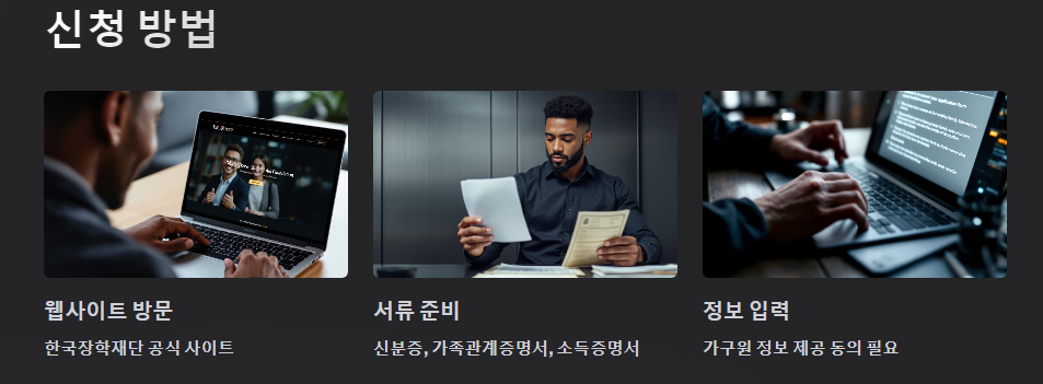 신청은 한국장학재단의 공식 웹사이트를 통해 진행됩니다. 신청 시 필요한 서류는 다음과 같습니다: