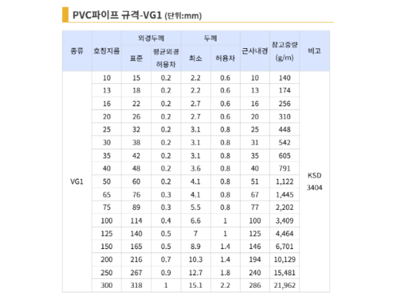 VG1과 VG2는 PVC파이프의 두께에 따라 구분됩니다. VG1은 두꺼운 배관으로, 높은 압력에 견딜 수 있는 특성을 가지고 있습니다. 반면, VG2는 상대적으로 얇은 배관으로, 경량화가 필요한 경우에 적합합니다. 아래의 표를 통해 두 규격의 차이를 확인할 수 있습니다.