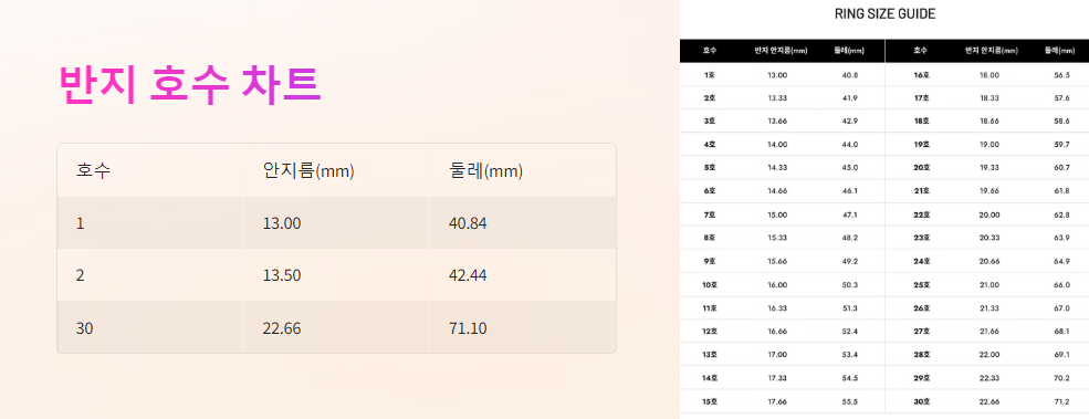 3. 호수 확인 : 측정한 길이를 반지 호수 차트에서 확인합니다.