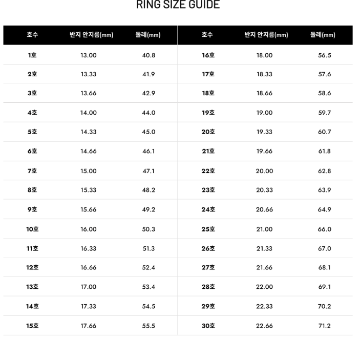 이 차트를 통해 손가락 둘레에 맞는 반지 호수를 쉽게 찾을 수 있습니다.