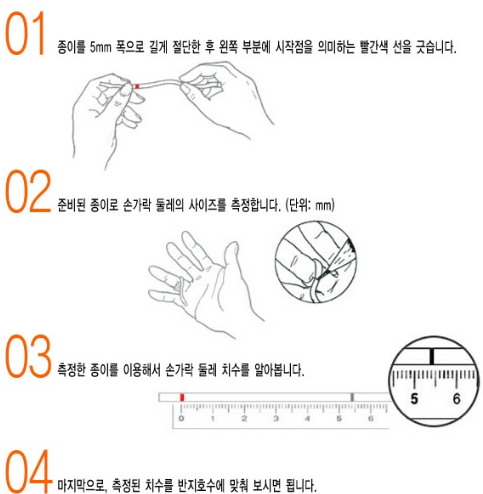 종이를 이용하여 반지 호수를 측정하는 방법은 간단합니다. 필요한 준비물은 종이, 자, 펜입니다. 우선 종이를 손가락에 감싸고, 겹치는 부분에 펜으로 표시한 후, 자로 그 길이를 측정합니다. 측정한 길이를 이용하여 아래의 차트에서 호수를 확인할 수 있습니다.
