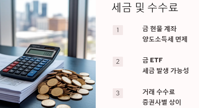 금 투자 시 세금과 수수료는 중요한 요소입니다. KRX 금 현물 계좌를 통해 금을 거래할 경우, 양도소득세가 면제되며, 이자 및 배당 소득세도 발생하지 않습니다. 하지만 금 ETF에 투자할 경우, 세금이 발생할 수 있으므로 투자 전에 반드시 확인해야 합니다. 또한, 거래 수수료는 증권사마다 다르므로, 여러 증권사의 수수료를 비교하여 선택하는 것이 좋습니다.