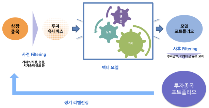 퀀트 투자 전략은 여러 단계로 나뉘어 있습니다. 먼저, 상장 종목을 선정하고, 투자 유니버스를 설정합니다. 이후 사전 필터링을 통해 거래량, 시가총액 등을 고려하여 종목을 선별합니다. 다음으로 팩터 모델을 적용하여 모멘텀, 실적, 가치 등을 분석하고, 마지막으로 사후 필터링을 통해 최종 투자 종목을 결정합니다. 이 과정에서 리스크 분산을 위해 10~20개의 종목으로 포트폴리오를 구성합니다.