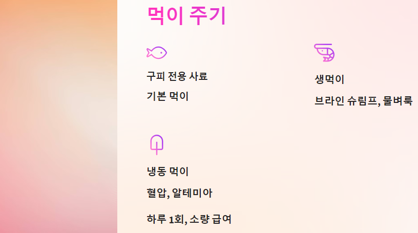 3.1 다양한 먹이 제공 구피는 잡식성으로 다양한 먹이를 주는 것이 좋습니다. 구피 전용 사료를 기본으로 하고, 가끔 살아있는 먹이(브라인 슈림프, 물벼룩)나 냉동 먹이(혈압, 알테미아)를 추가로 제공하세요.