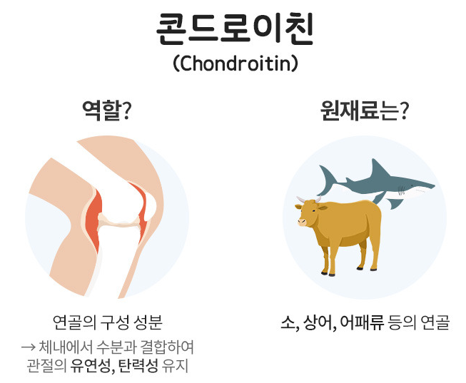 콘드로이친은 연골의 주요 구성 성분 중 하나로, 관절의 탄력성과 강도를 유지하는 데 중요한 역할을 합니다. 콘드로이친은 연골의 수분을 유지하고, 관절의 마찰을 줄여주는 역할을 하여 관절의 건강을 지키는 데 도움을 줍니다.