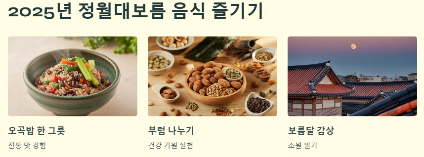 2025년 정월대보름 음식 이야기를 통해 전통의 맛과 의미를 가족과 함께 되새겨보세요. 현대 생활에서는 모든 전통을 지키기 어려울 수 있지만, 오곡밥 한 그릇이나 부럼을 나누는 작은 실천만으로도 정월대보름의 의미를 충분히 느낄 수 있습니다. 또한, 이 날에는 보름달을 바라보며 소원을 빌어보는 것도 좋겠죠.