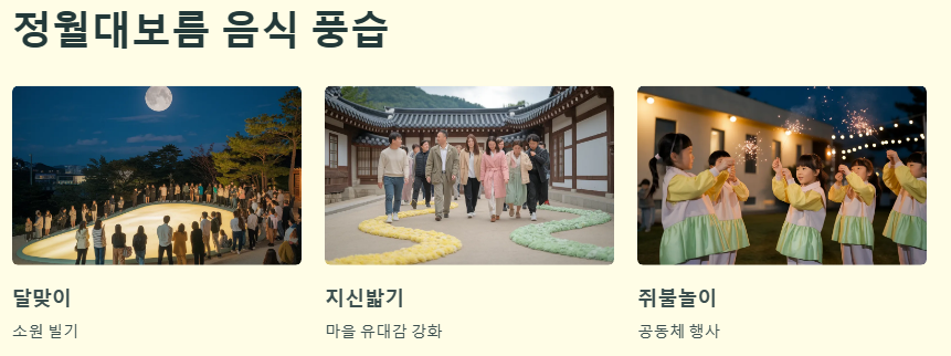 정월대보름 음식 이야기는 음식을 나누는 것을 넘어, 다양한 전통 풍습과 함께합니다. 예를 들어, 달맞이를 하며 소원을 빌고, 지신밟기나 쥐불놀이 같은 공동체 행사를 통해 마을의 유대감을 강화하기도 합니다. 이러한 풍습 속에서 정월대보름 음식은 단지 배를 채우는 것이 아니라, 마음을 나누고 공동체의 결속을 다지는 중요한 역할을 합니다.