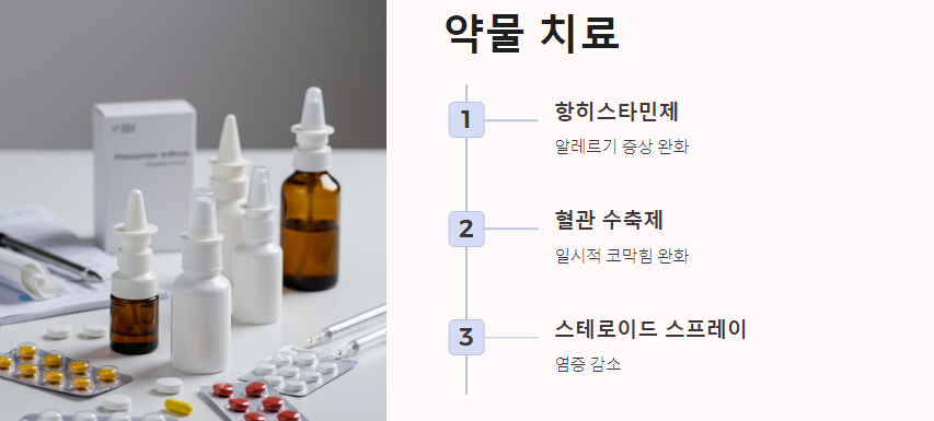 코막힘이 심하거나 오래 지속되면 병원에 방문하여 진료를 받고 적절한 약물 치료를 받는 것이 중요해요. 의사의 처방에 따라 항히스타민제, 혈관 수축제, 스테로이드 스프레이 등을 사용할 수 있습니다.