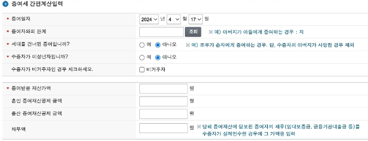 - 정보 입력 : 증여자와 수증자의 관계, 증여일자, 증여재산의 종류 및 가치를 입력합니다.