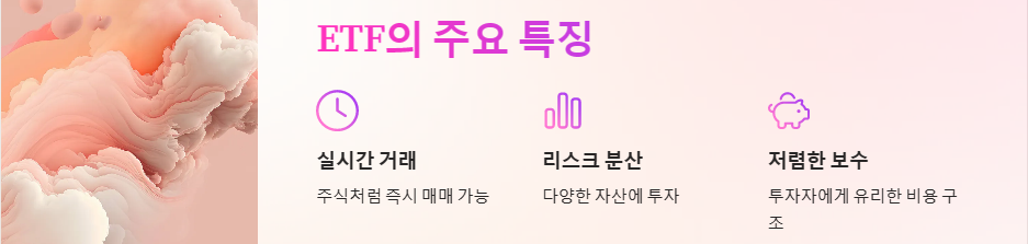 ETF는 몇 가지 독특한 특징을 가지고 있습니다. 첫째, ETF는 주식처럼 거래소에서 실시간으로 매매가 가능합니다. 둘째, 다양한 자산에 투자할 수 있어 리스크 분산이 용이합니다. 셋째, 운용 보수가 상대적으로 저렴하여 투자자에게 유리합니다.