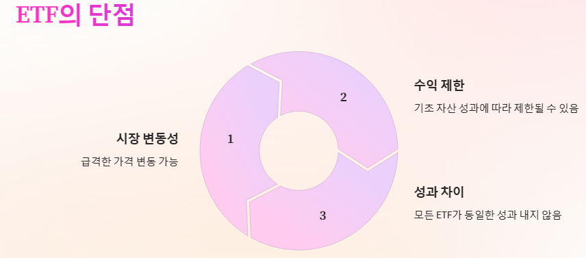 하지만 ETF에도 단점이 존재합니다. 첫째, 시장의 변동성에 따라 가격이 급격히 변동할 수 있습니다. 둘째, 특정 ETF는 기초 자산의 성과에 따라 수익이 제한될 수 있습니다. 마지막으로, 모든 ETF가 동일한 성과를 내는 것은 아니므로, 투자 전 충분한 분석이 필요합니다.