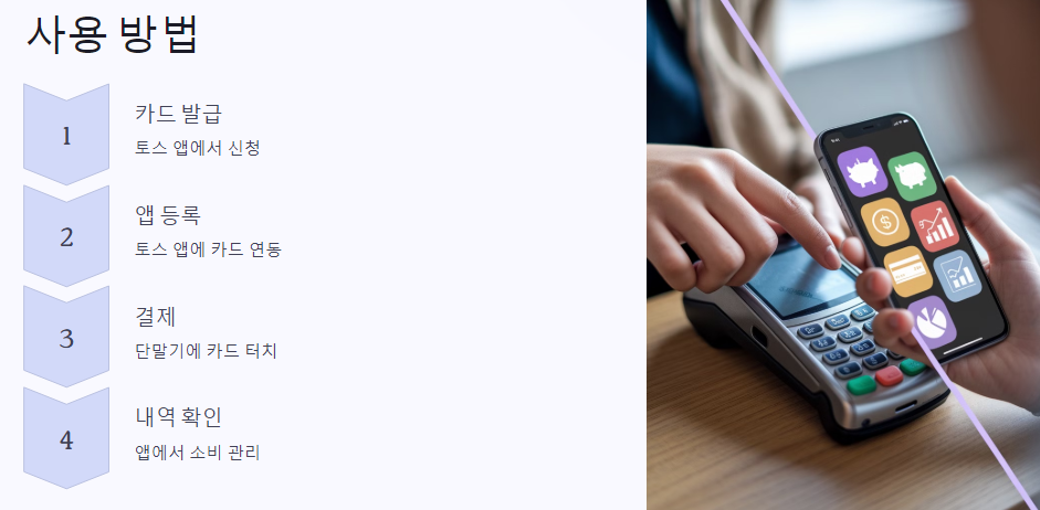 토스 유스카드를 사용하는 방법은 매우 간단합니다. 카드 발급 후, 토스 앱을 통해 카드를 등록하면 언제 어디서나 사용할 수 있습니다. 물건을 구매할 때나 대중교통을 이용할 때, 카드 단말기에 카드만 대면 끝입니다.