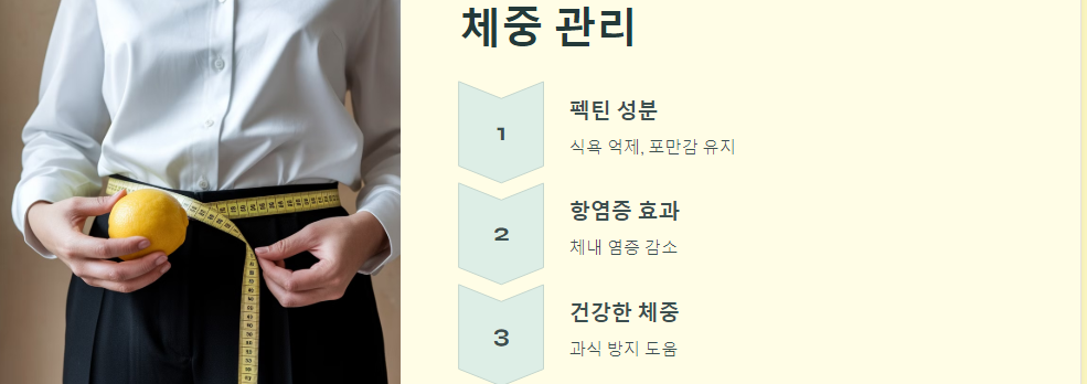 레몬껍질은 체중 관리를 도와줍니다. 레몬껍질에 함유된 펙틴 성분은 식욕을 억제하고 포만감을 오래 유지하게 하여 과식을 방지하는 데 도움을 줍니다. 또한, 레몬껍질의 항염증 성분은 체내 염증을 감소시켜 건강한 체중을 유지하는 데 도움이 됩니다.