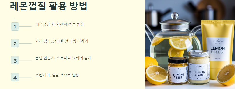 - 스킨케어: 레몬껍질을 갈아 꿀이나 요거트와 섞어 얼굴 팩으로 사용하면 피부를 밝고 건강하게 유지할 수 있습니다.