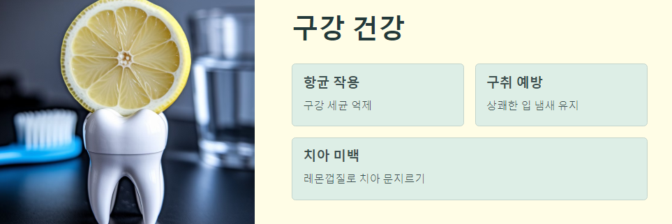 레몬껍질은 구강 건강을 유지하는 데 도움을 줍니다. 레몬껍질의 항균 성분은 구강 내 세균을 억제하고 구취를 예방합니다. 또한, 레몬껍질을 사용하여 치아를 문지르면 치아 미백 효과도 얻을 수 있습니다.