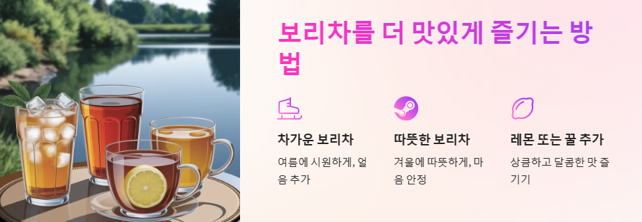 - 레몬 또는 꿀 추가: 보리차에 레몬즙이나 꿀을 추가하면 상큼하고 달콤한 맛을 즐길 수 있습니다.